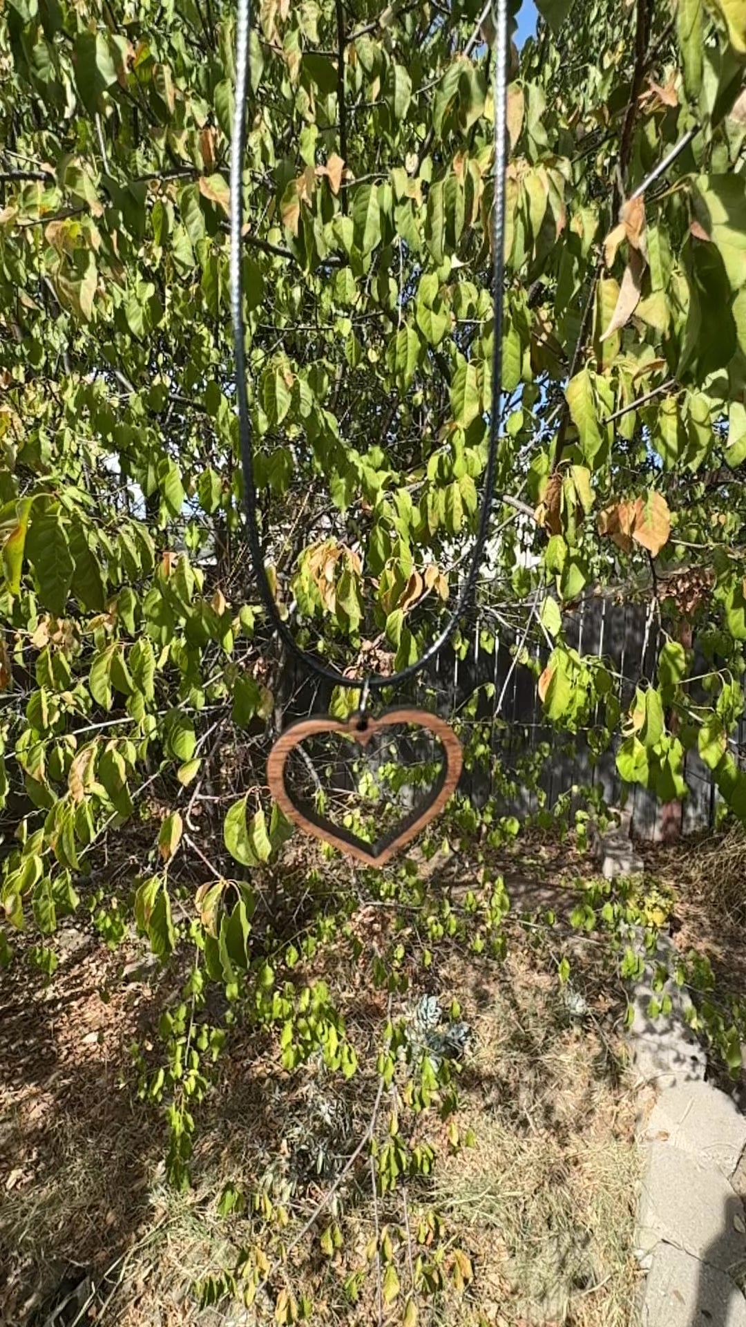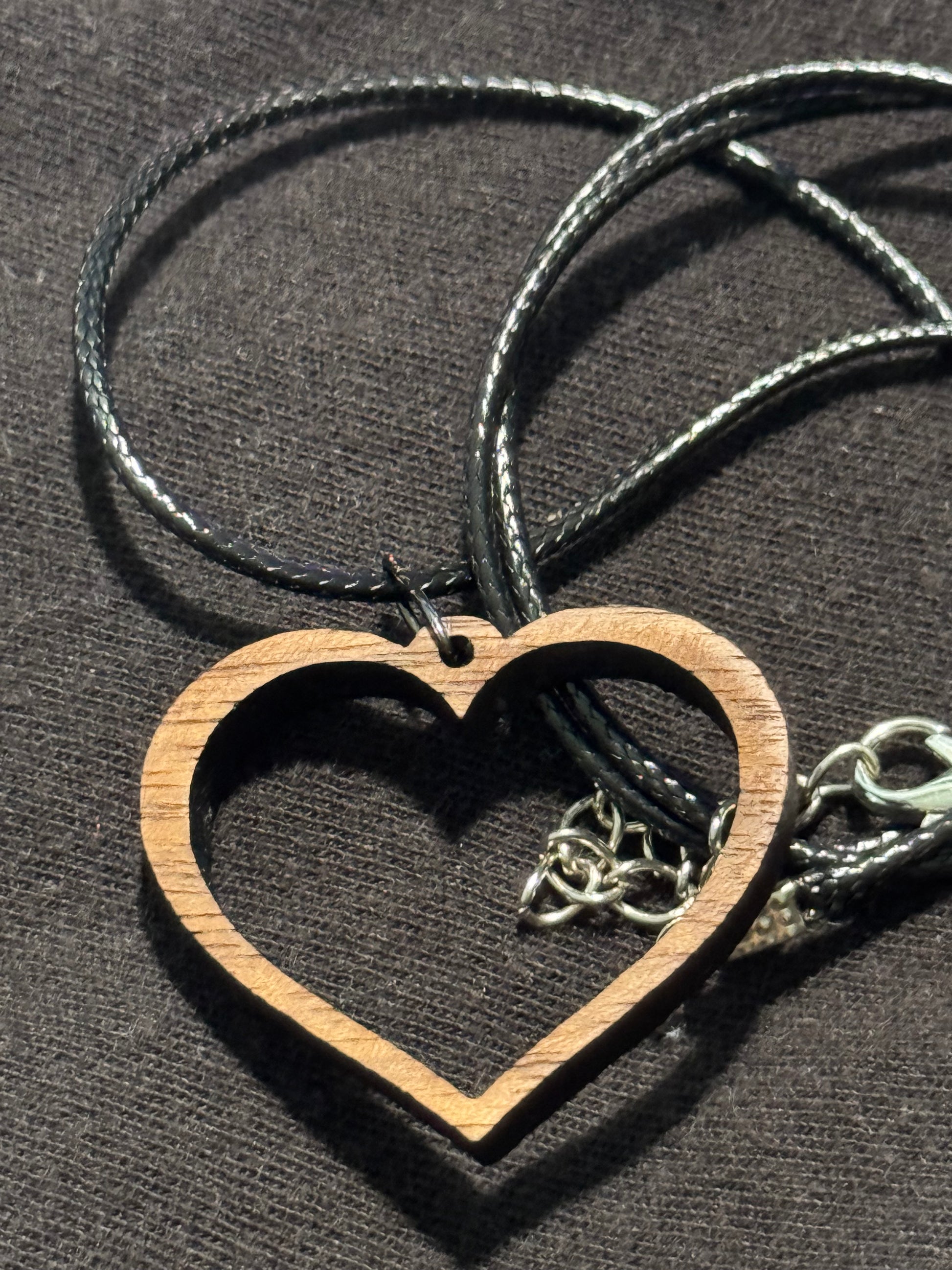This beautiful open heart walnut is finished with a natural beeswax and orange oil finish to bring out the beautiful details in the wood. It's hung from a 20" cord with locking lobster hook.
