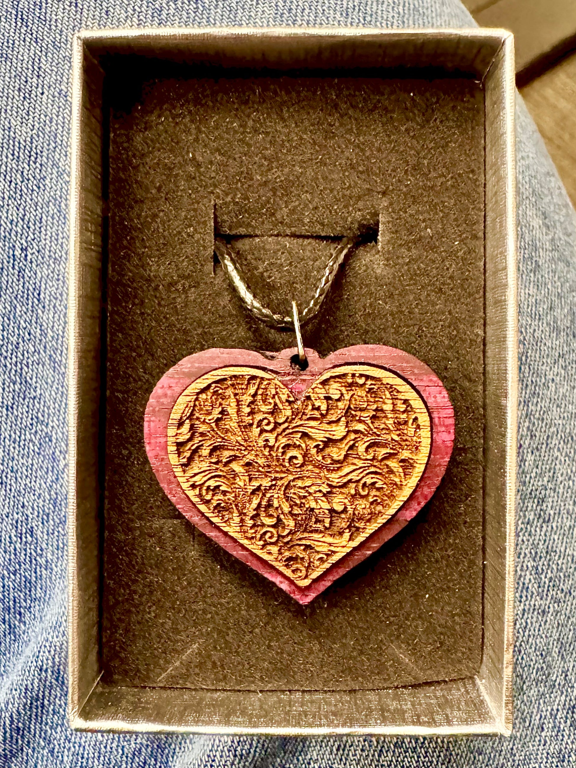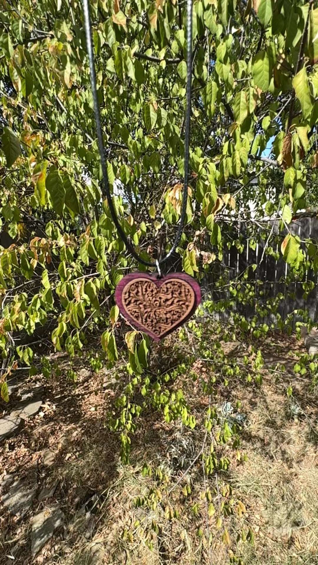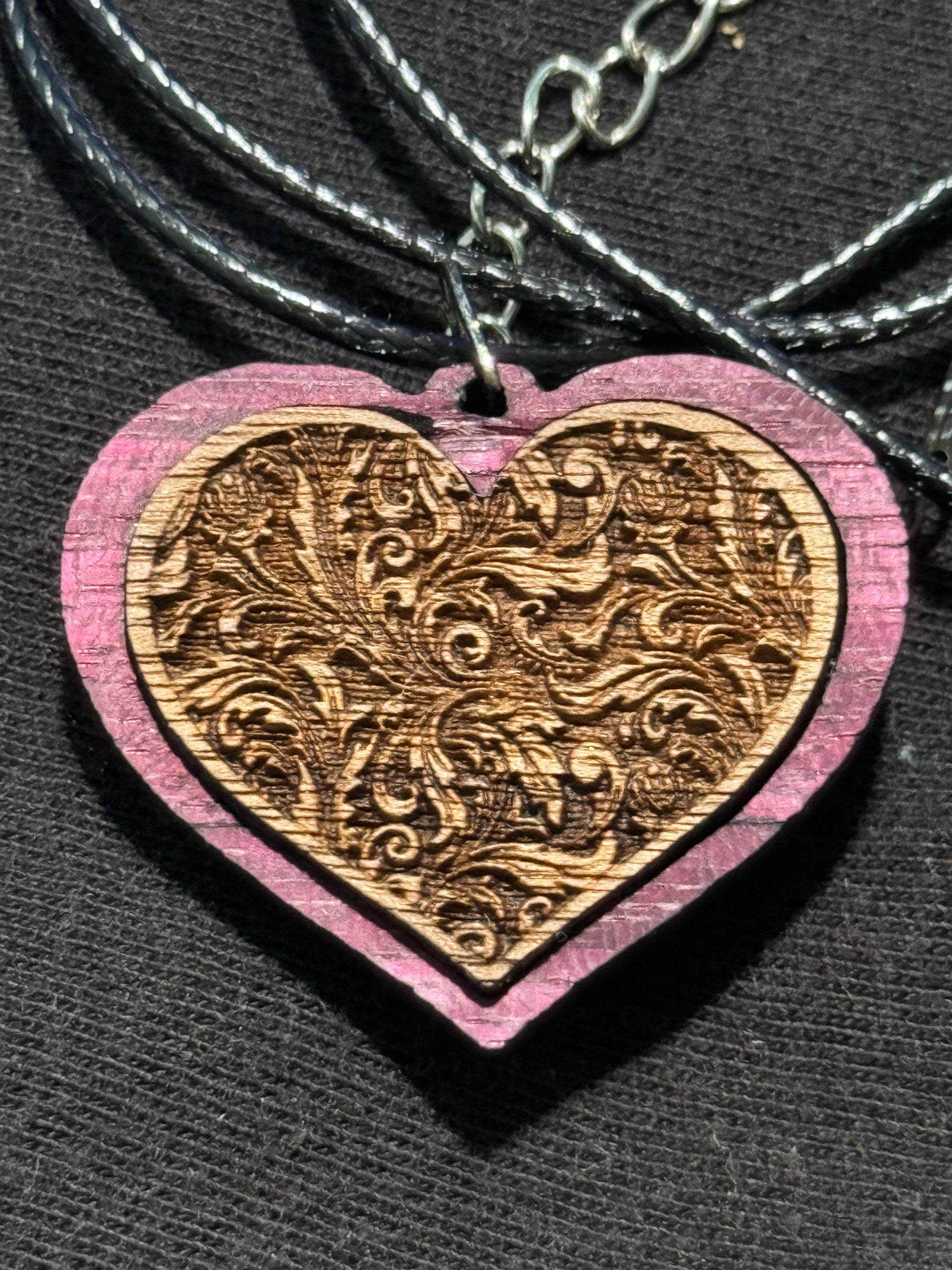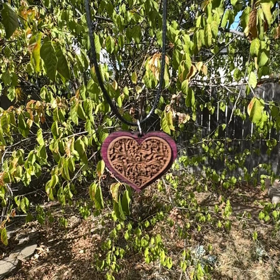 This beautiful heart pendant has a purpleheart outside with a Walnut center, The walnut center is deeply embossed with a filigree pattern, finished with a natural beeswax and orange oil finish to bring out the beautiful details in the wood. It's hung from a 20" cord with locking lobster hook.
